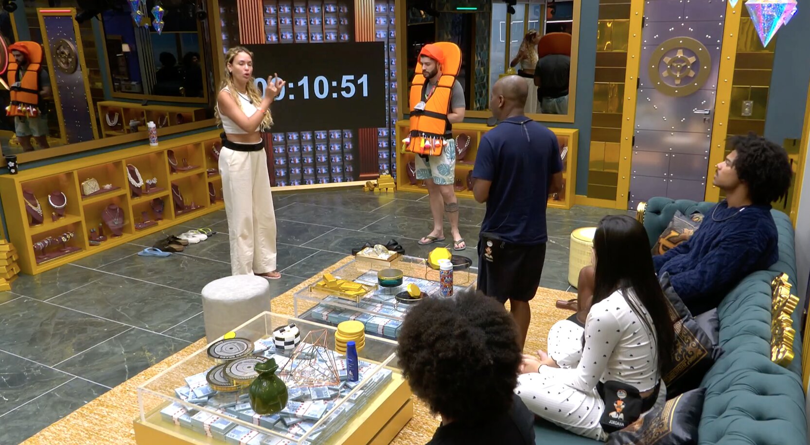 Com a casa lotada, os participantes tentaram organizar a ordem do Raio-X — aquele momento obrigatório matinal onde eles avaliam os colegas — usando seus chinelos para marcar a vez. A ideia parecia boa na teoria, mas na prática, foi um desastre.